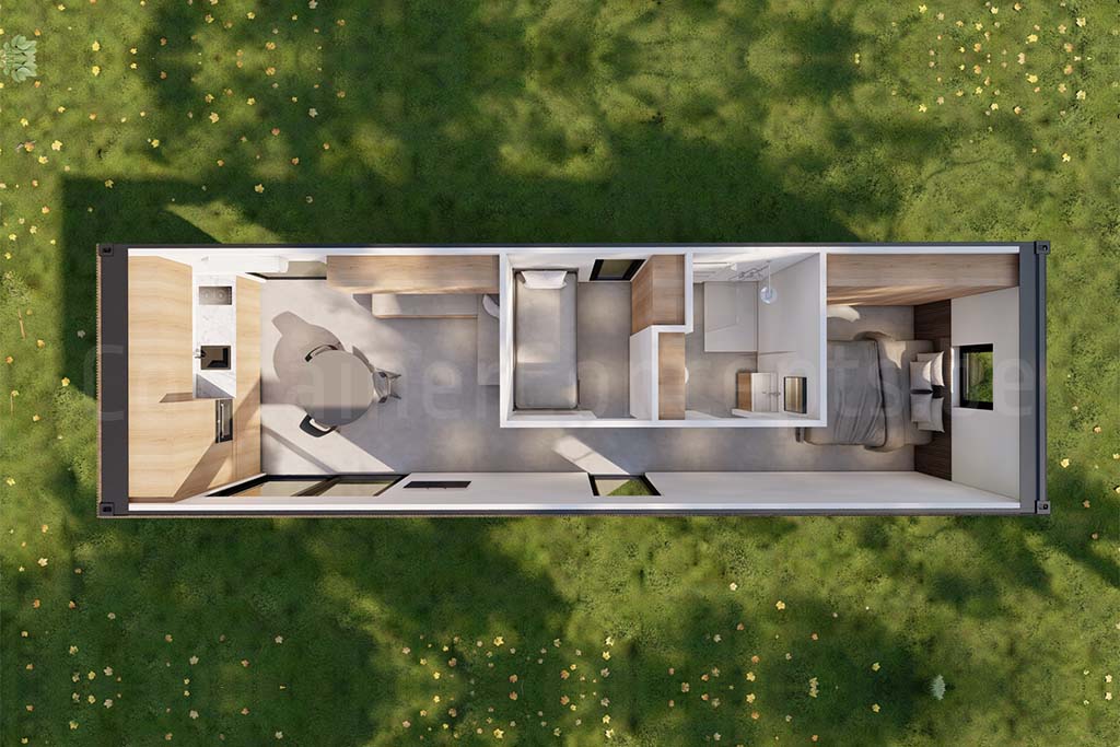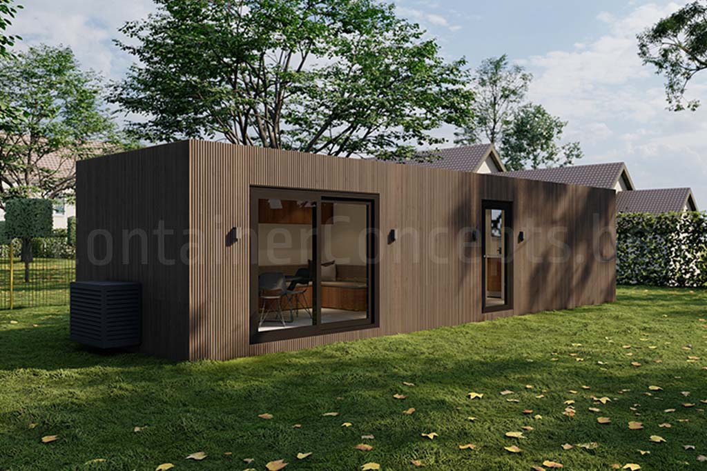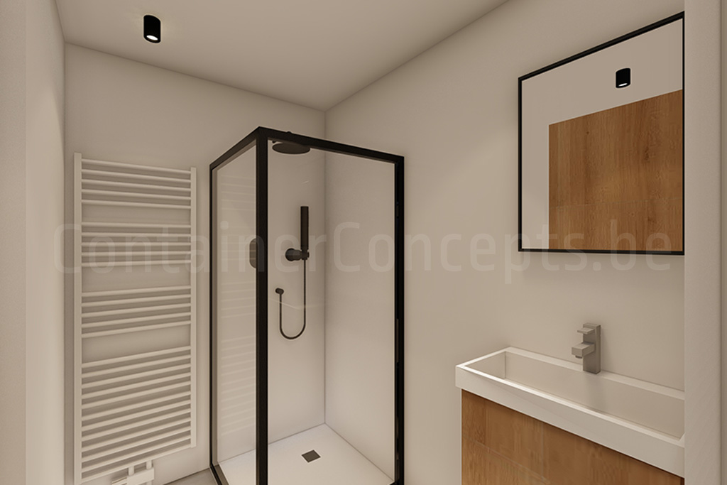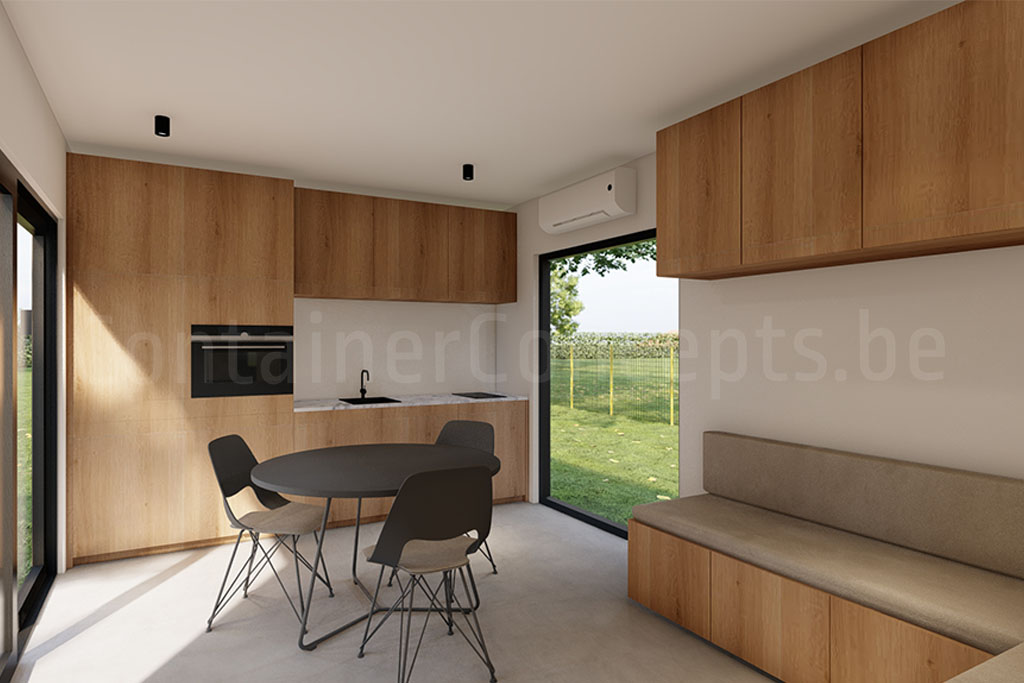 Het Concept vertrekt vanuit een 40 voet container die we uitrusten met een leefruimte, sanitair gedeelte, keukenhoek en slaapruimte – allemaal perfect afgewerkt met hoogstaande materialen.