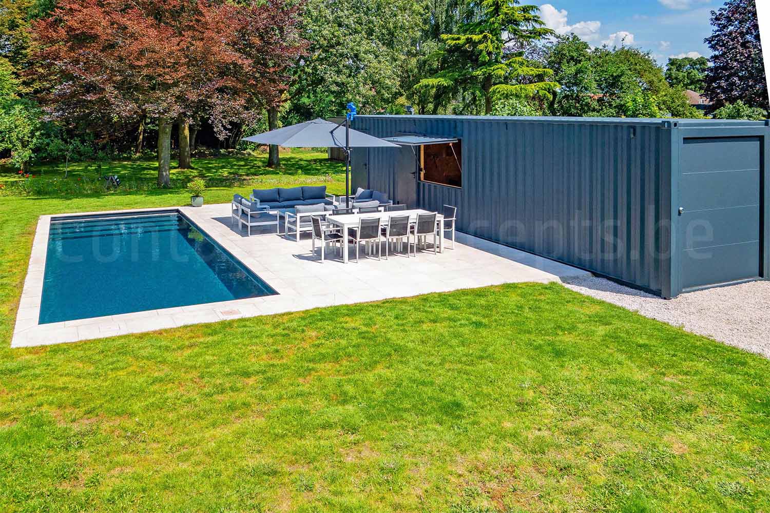 Bar et stockage dans un conteneur de 40 pieds qui s’intègre parfaitement à la piscine. Toutes les boissons et fournitures pour une journée sans souci à la piscine sont logées dans ce conteneur. Ce concept a également été doté d’un vaste espace de stockage et abrite l’installation de la piscine et bien d’autres choses encore.