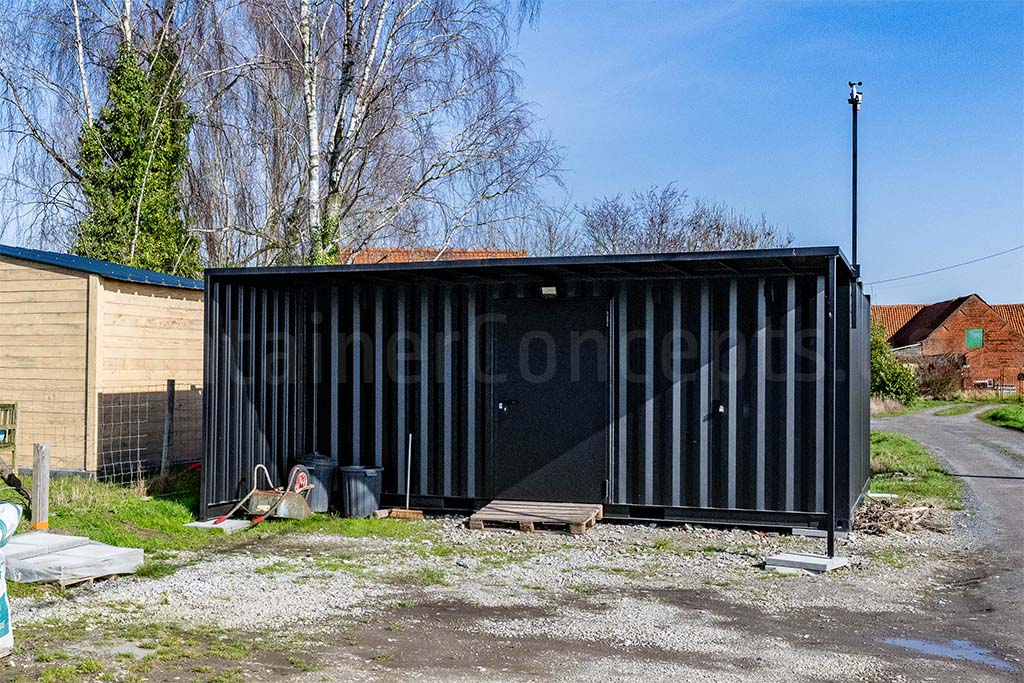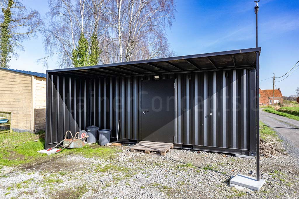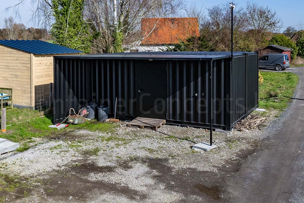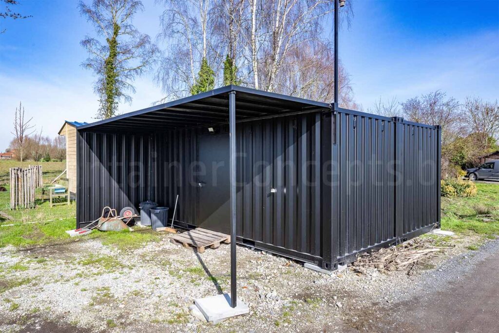 Ce conteneur de stockage est équipé d’une porte d’accès robuste en acier, ce qui rend l’espace à la fois sûr et facilement accessible. Du côté de l’entrée, un auvent a également été installé afin d’offrir une protection supplémentaire lors de l’ouverture de la porte ou lors du chargement et du déchargement de matériel.