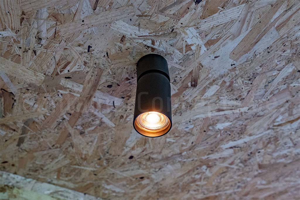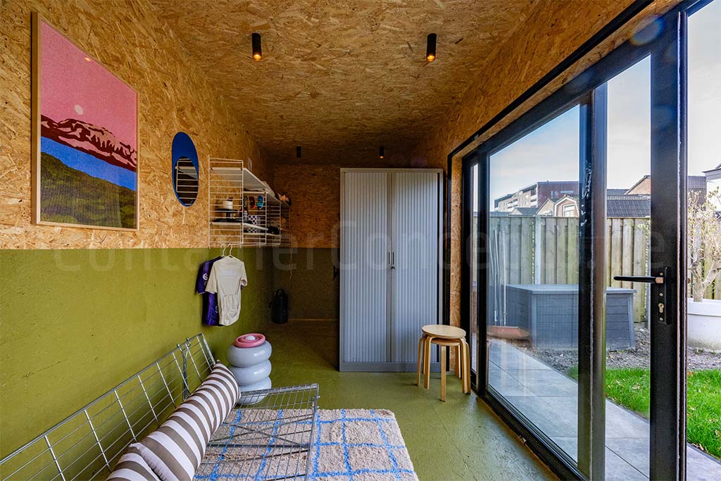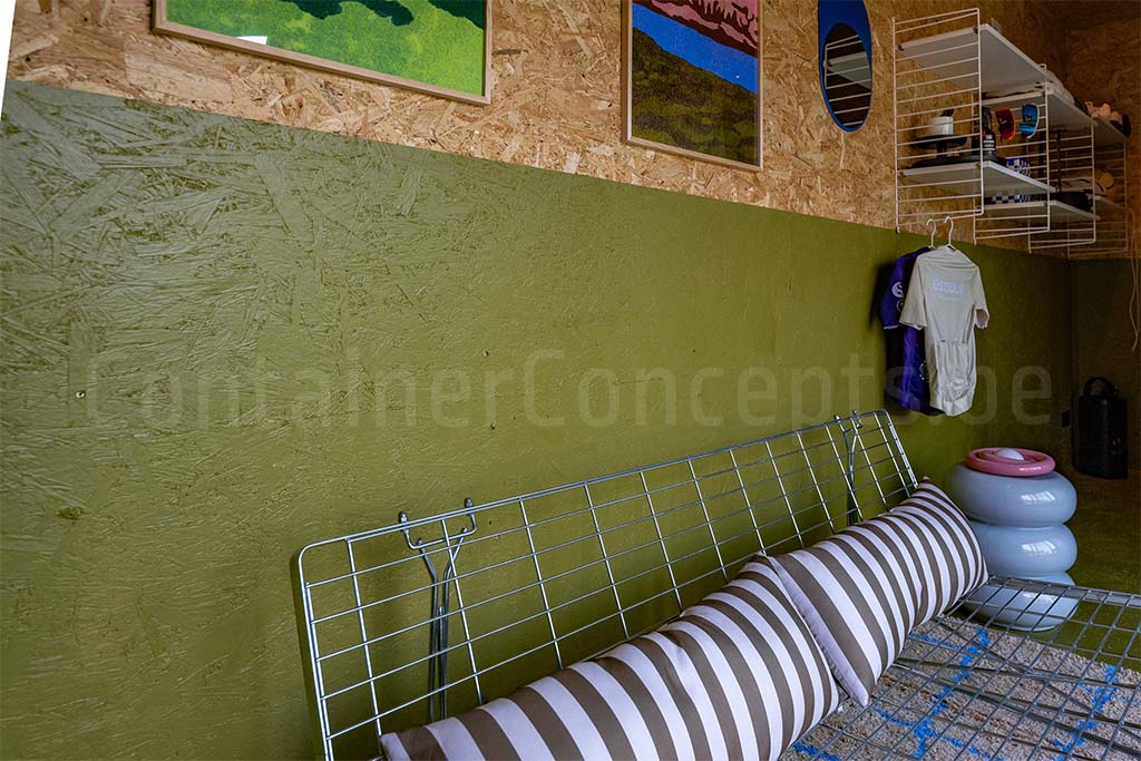 Sur le long côté se trouve une baie coulissante pratique, apportant lumière et ventilation. Des spots extérieurs illuminent le conteneur, permettant de profiter de l’espace lounge en soirée dans une ambiance agréable. À l’intérieur, les murs, le plafond et le sol sont soigneusement finis avec des panneaux OSB, offrant solidité et esthétique. Des spots LED au plafond assurent un éclairage clair, et les prises électriques intégrées facilitent l’utilisation d’appareils.
