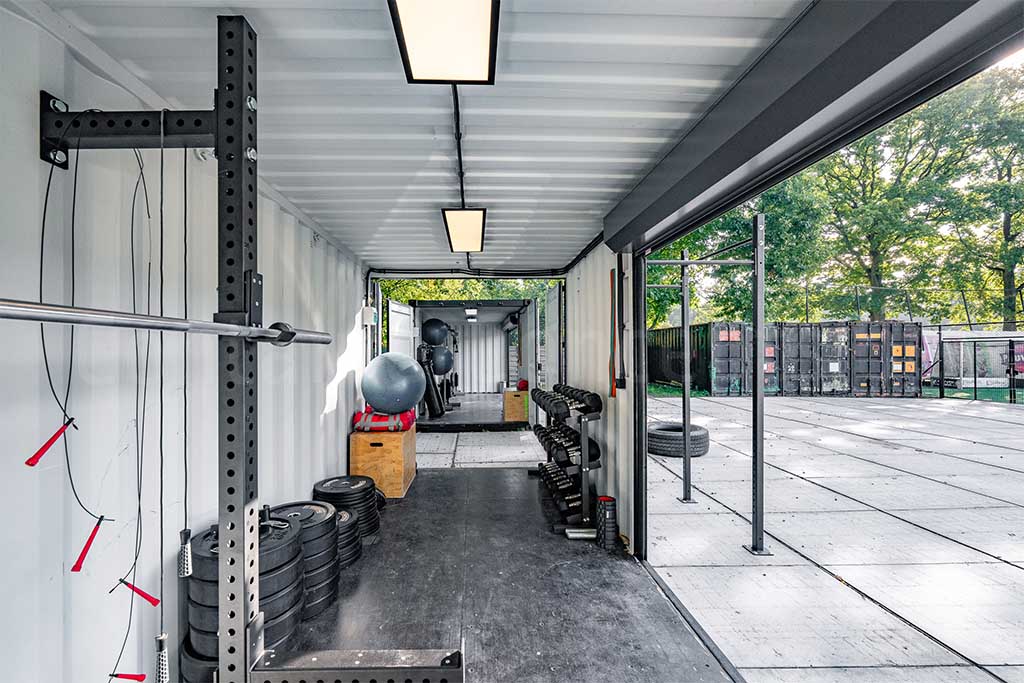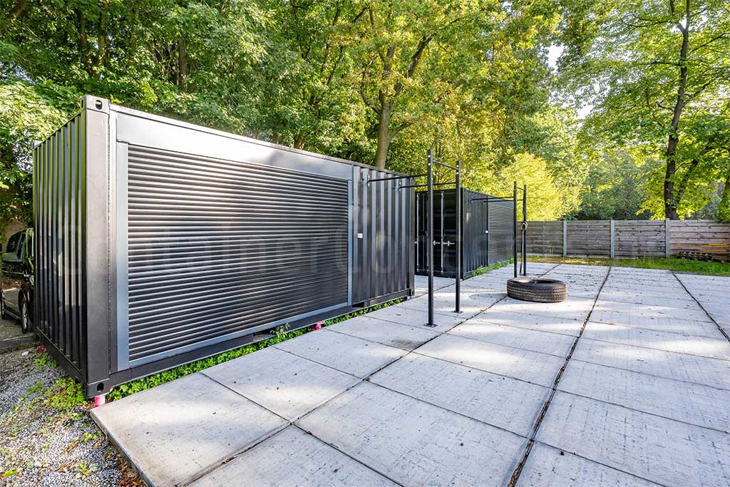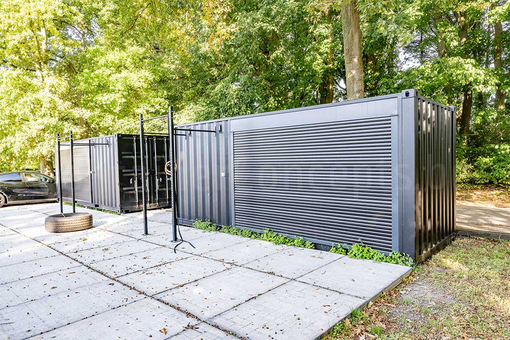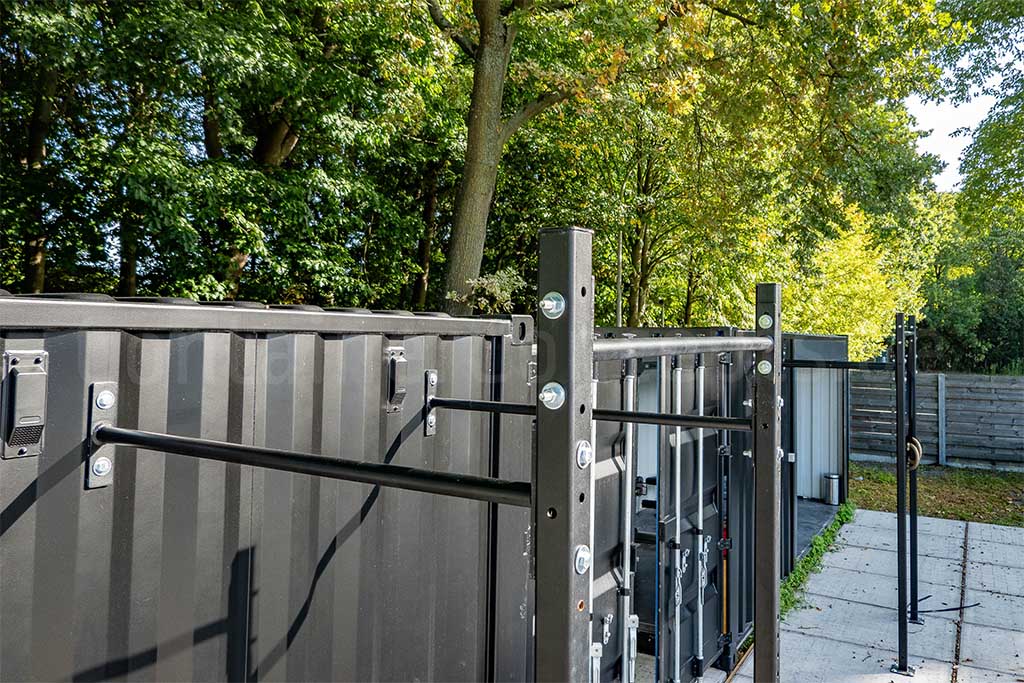 À l’extérieur, chacun des conteneurs sportifs est équipé d’un rack de fitness – idéal pour les tractions, les étirements et l’entraînement fonctionnel. À l’intérieur, il y a suffisamment d’espace pour ranger l’équipement et les deux conteneurs sont équipés d’un banc robuste pour les exercices de musculation. L’extérieur a une finition noire élégante, l’intérieur un ton gris professionnel.