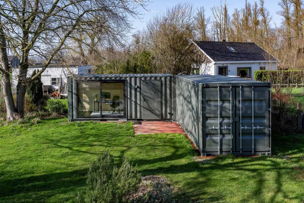 Le second conteneur sert d’espace de stockage pour le bois, ce qui permet de combiner parfaitement cet espace de bureau avec une zone de stockage fonctionnelle. L’ensemble a été peint en gris à l’extérieur, offrant une apparence moderne et épurée qui s’intègre harmonieusement dans l’environnement.
