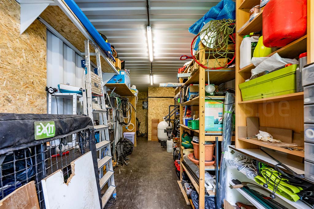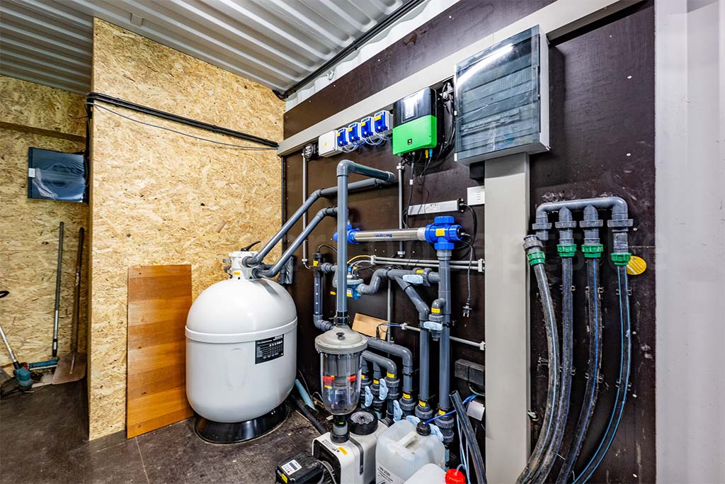 Le conteneur est aménagé en un local technique spacieux où toutes les installations de piscine, telles que les filtres, les pompes et les conduites, trouvent aisément leur place. Il reste en outre suffisamment d’espace pour le stockage de divers matériaux et outils. Le local est fini avec des parois solides en OSB et conserve le plancher d’origine du conteneur, ce qui lui confère un aspect robuste et durable. Grâce à l’éclairage LED de type TL et à la présence de plusieurs prises électriques, cet espace est entièrement fonctionnel. De plus, un espace toilette séparé est intégré au local technique, ce qui améliore considérablement le confort d’utilisation.