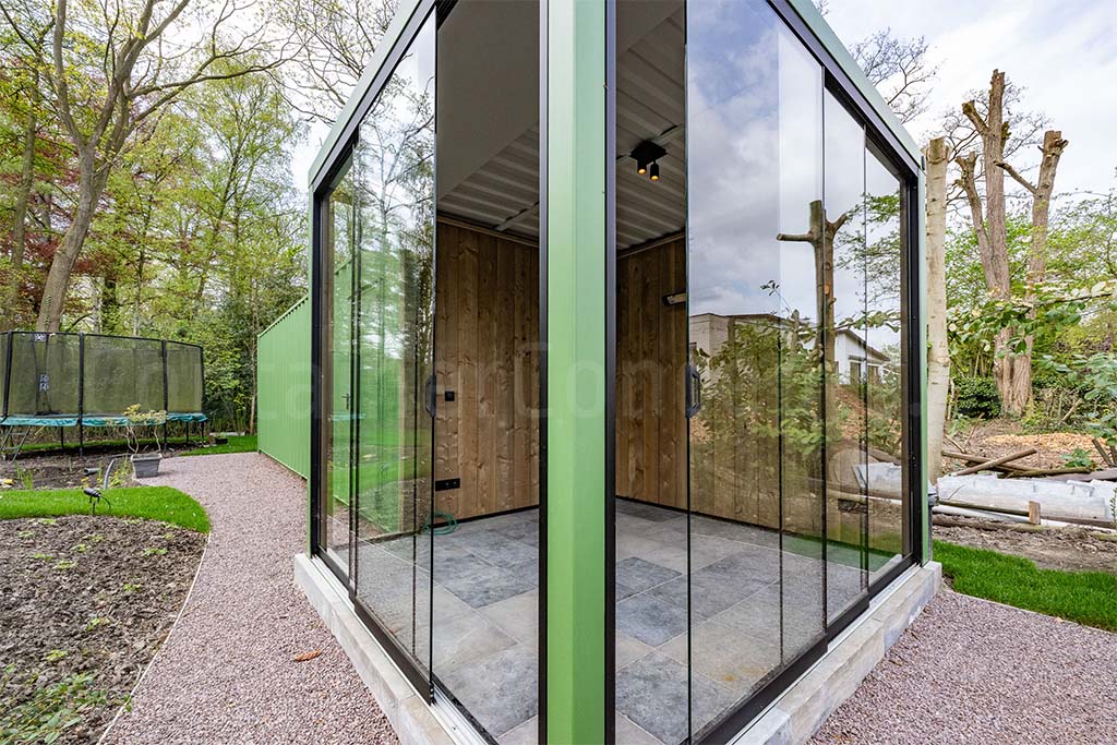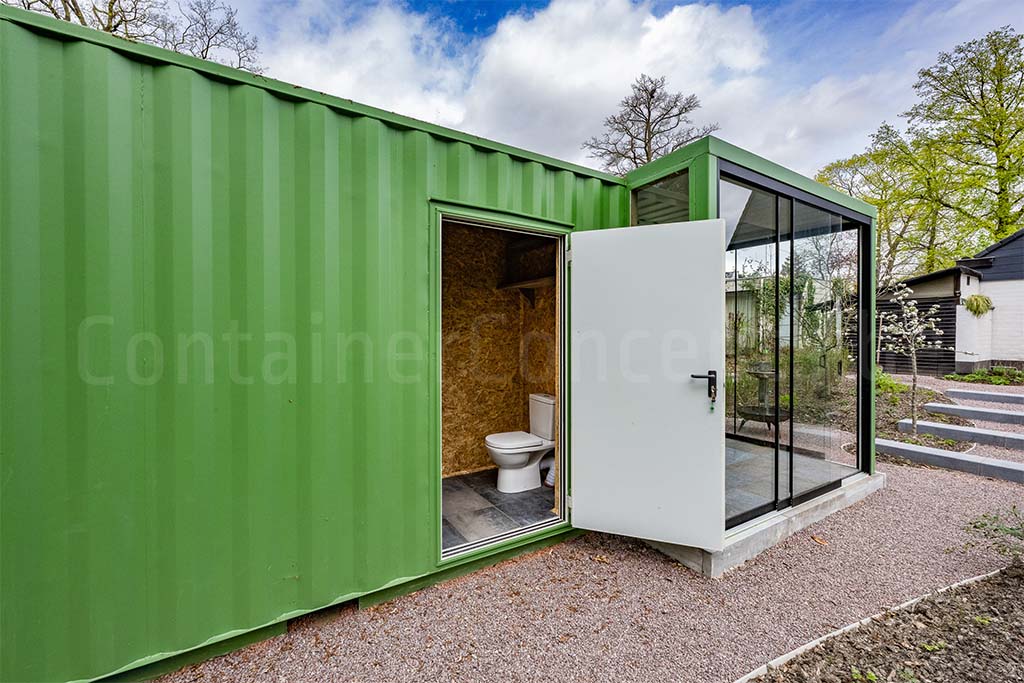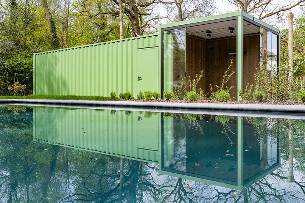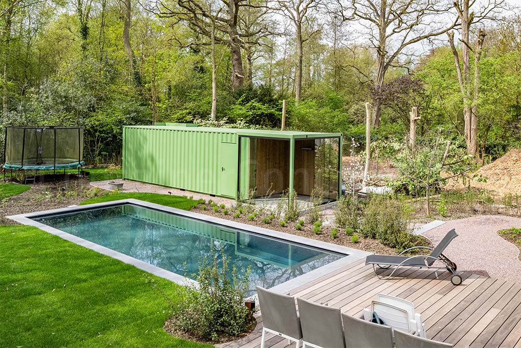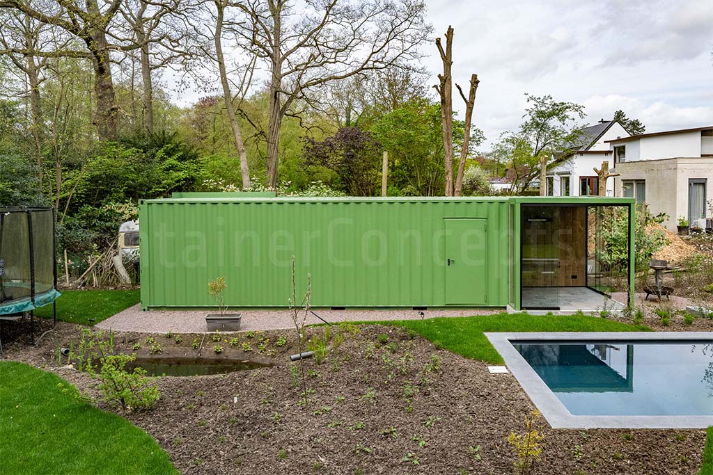 L’extérieur du conteneur est revêtu d’une couleur verte, lui permettant de s’intégrer harmonieusement dans l’environnement du jardin.