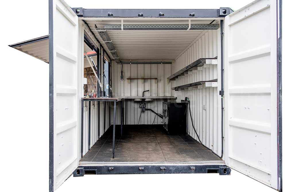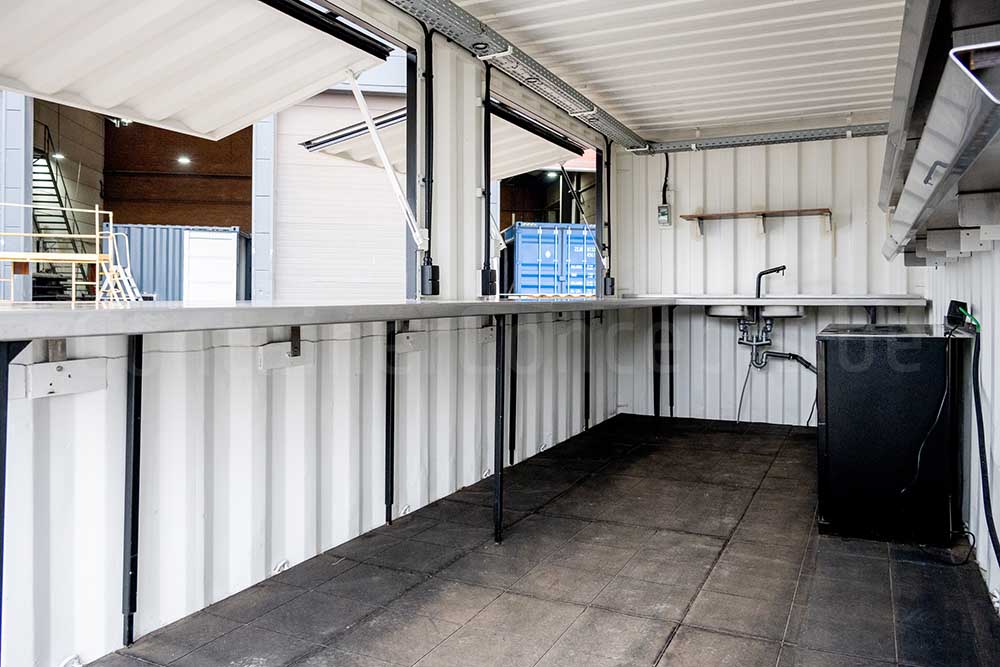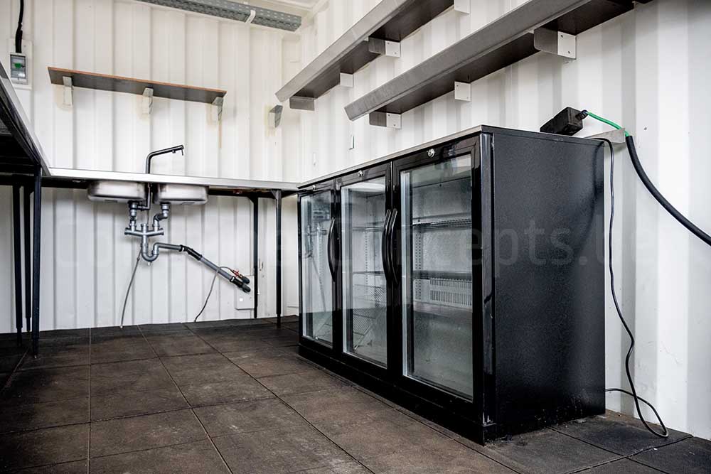 À l’intérieur, le conteneur est aménagé de manière fonctionnelle avec un plan de préparation pour cocktails et boissons, des éviers, un réfrigérateur, des étagères, un éclairage et des prises électriques.