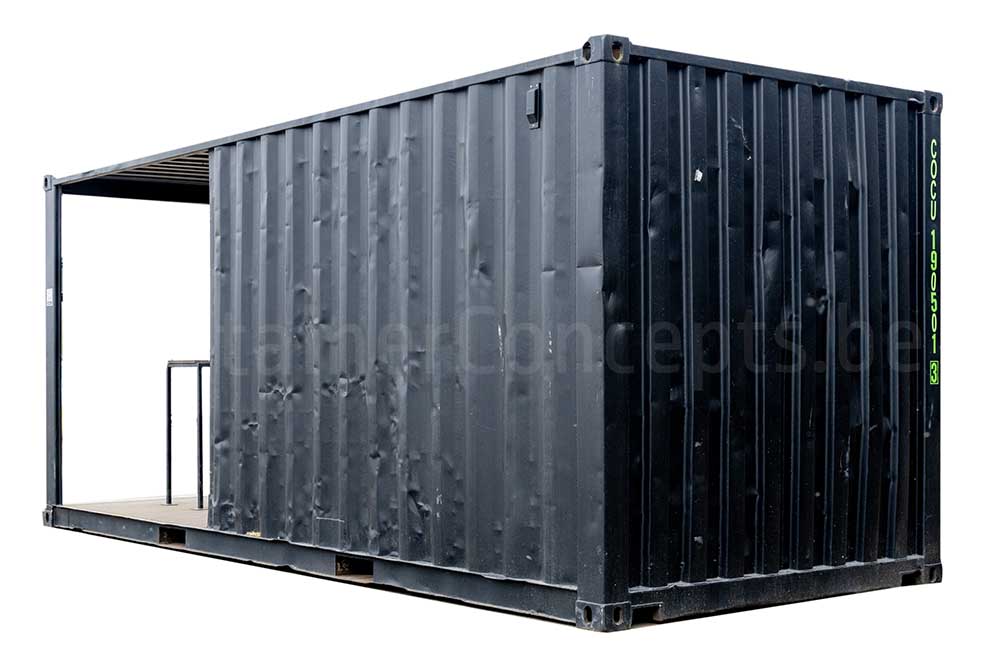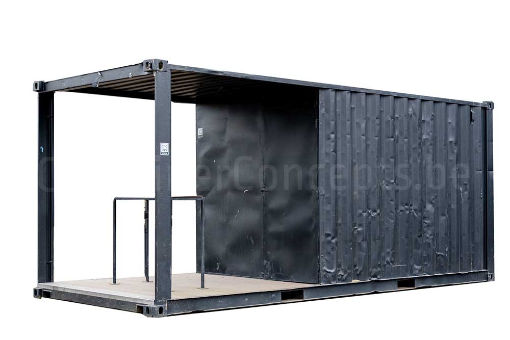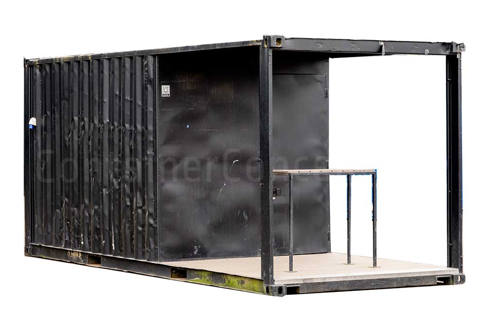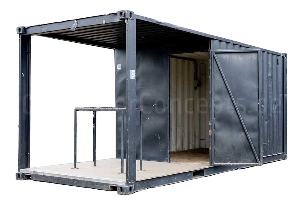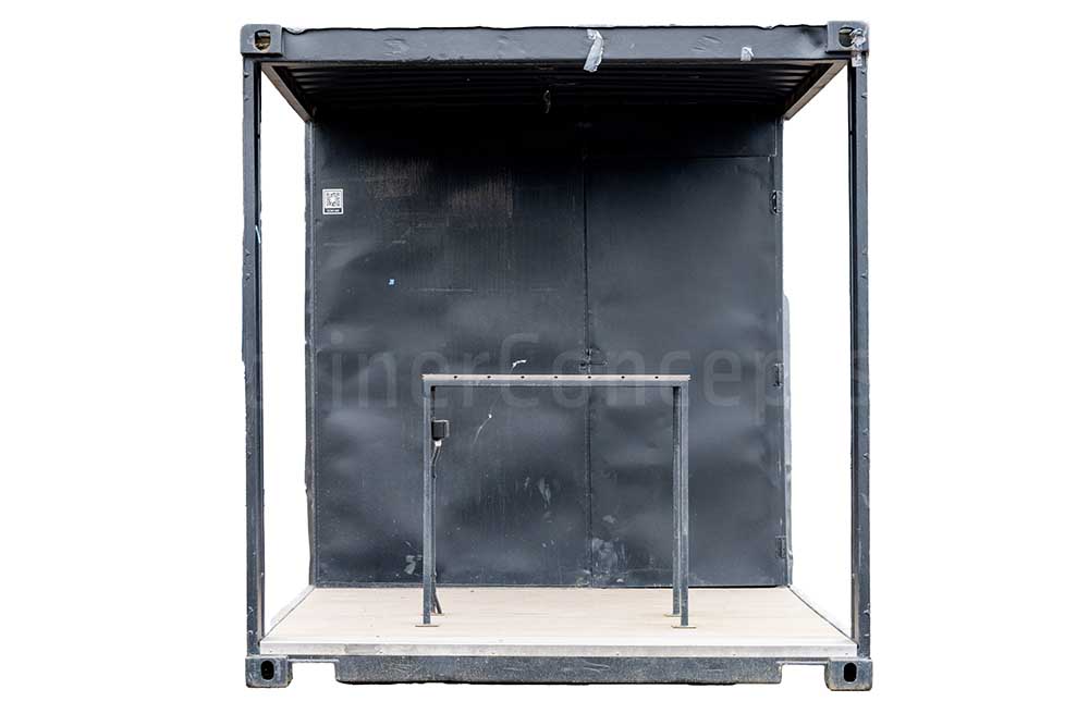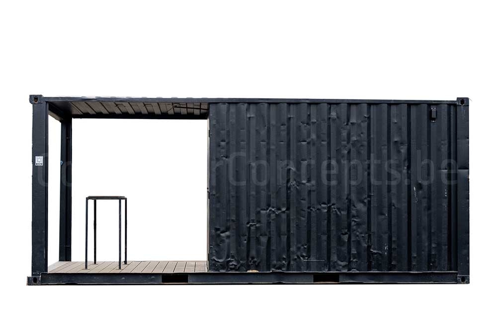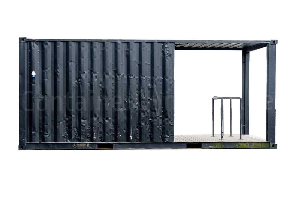 L’autre moitié a été transformée en terrasse ouverte et couverte pour accueillir le personnel. Les parois latérales de cette partie ont été entièrement supprimées, mais le toit du conteneur a été conservé pour offrir une protection. Une table haute a été installée sur la terrasse.