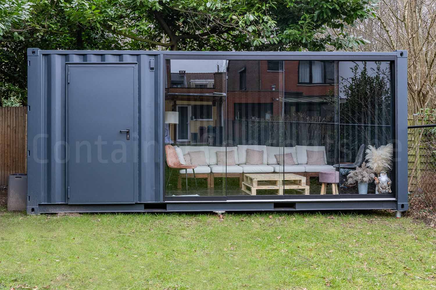 Een container lounge met schuifraam over de gehele lange zijde