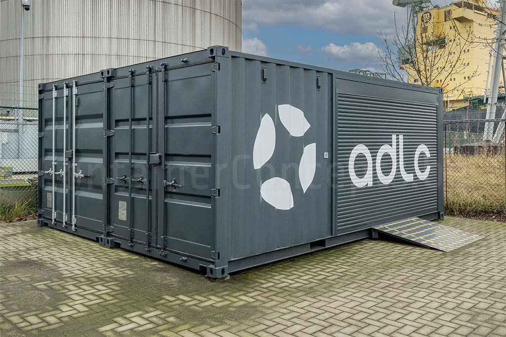 De buitenzijde van deze containergarage is strak gespoten in grijs en voorzien van het ADLC-logo, wat zorgt voor een professionele uitstraling. Aan de voorzijde werd een sectionaalpoort geplaatst, bedienbaar via een klavier met toegangscode, voor extra veiligheid en gebruiksgemak.