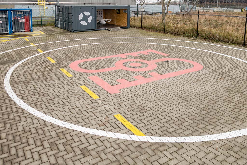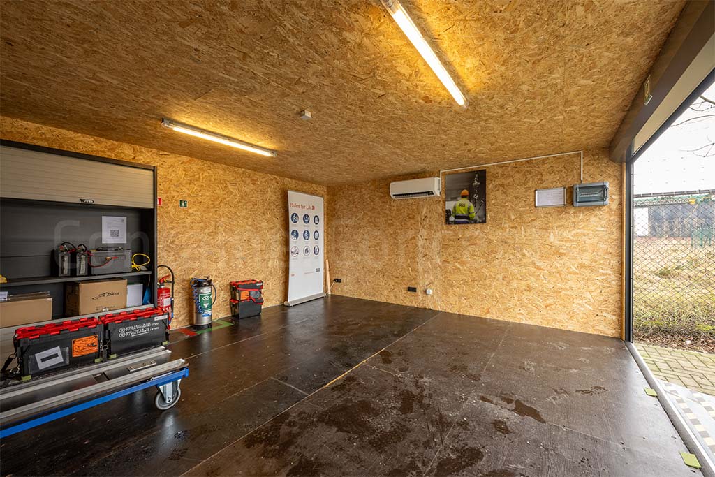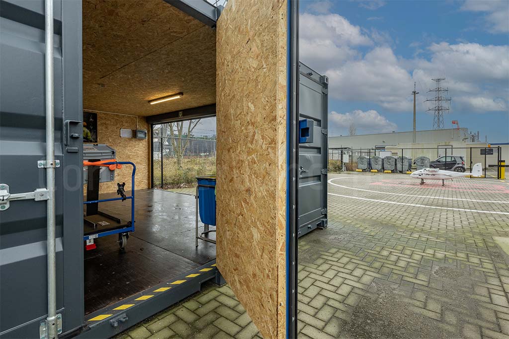 Aan de zijkant werden brede toegangsdeuren voorzien, inclusief een oprijramp voor vlotte toegang van de drone. De binnenzijde is volledig afgewerkt met OSB-platen, wat zorgt voor een nette en robuuste afwerking. Voor een optimale temperatuurregeling is de unit uitgerust met airconditioning.