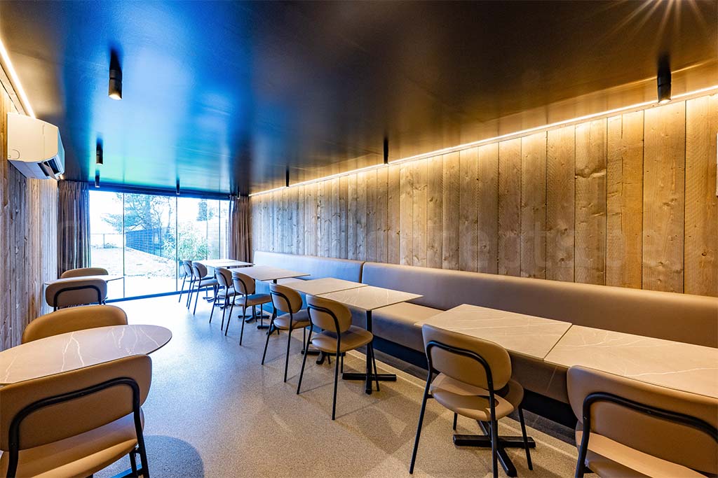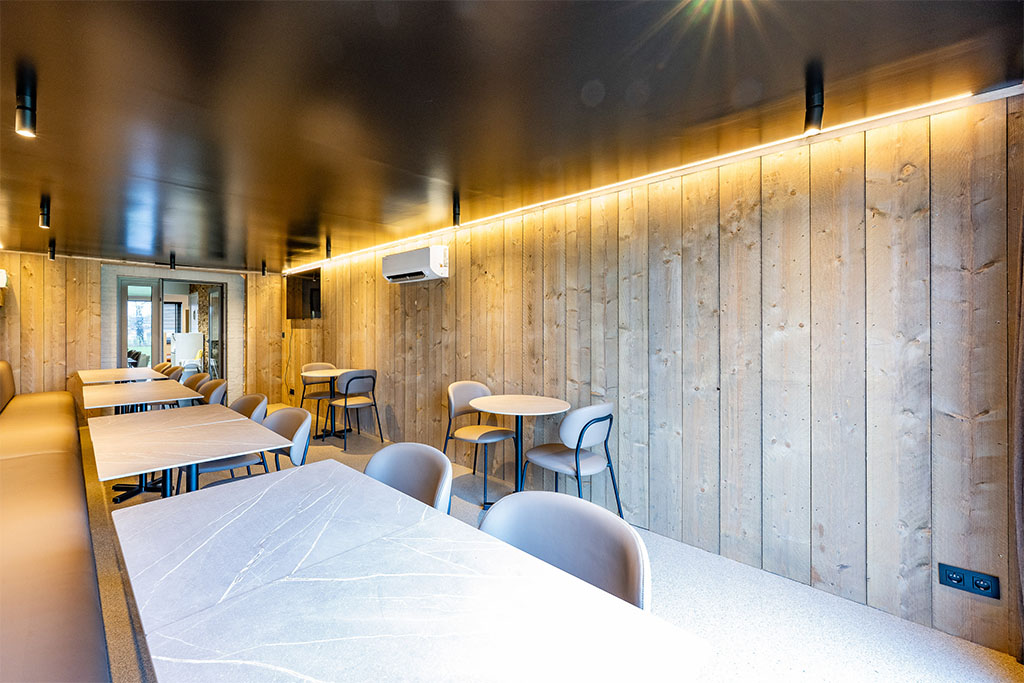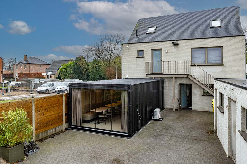 Frituur ’t Smulhuis in Wiekevorst was op zoek naar extra zitruimte voor hun klanten. Voor dit project, startten we van een standaard nieuwe 40ft container die ingekort en verbreed werd om zo op 8×3,5m uit te komen. Op de kopse kant werd een schuifraam ingebouwd die een mooie lichtinval verzorgt en tegelijkertijd dienst doet als toegang tot het terras. De andere korte zijde werd verwijderd en naadloos tegen het bestaande pand geplaatst.