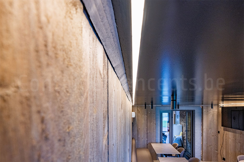 Binnenin werden de containerwanden van de zitruimte voor deze frituur afgewerkt met steigerhout, voorzien led spots en strips in de verlichting en werd de vloer betegeld. Een airconditioning unit verzorgt het jaar rond een aangename temperatuur om frietjes in te verorberen. De buitenzijde van de container werd in het zwart gespoten.