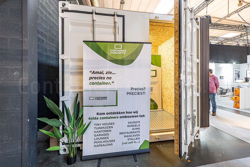 Onze beursstand op de bouw en reno beurs in Antwerp Expo is in essentie de prachtige Santorini loungecontainer. We vertrokken van een nieuwe (one-trip) 40ft container en kortten deze in. Het geheel werd onderverdeeld in een afgescheiden lounge- en berginggedeelte (respectievelijk 6m en 3m).