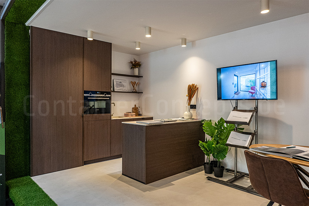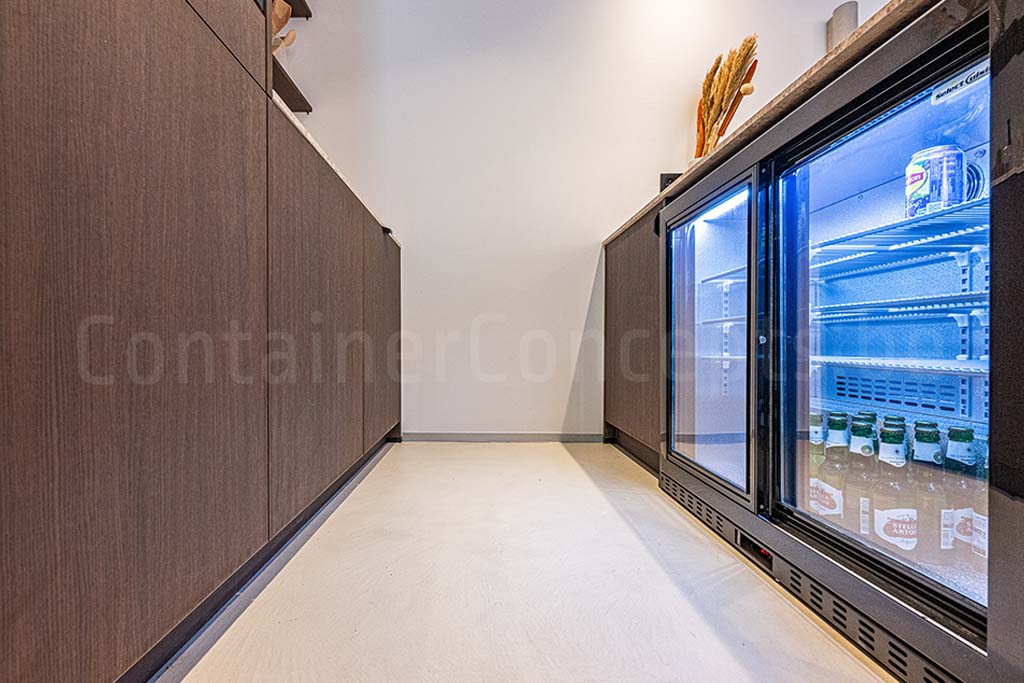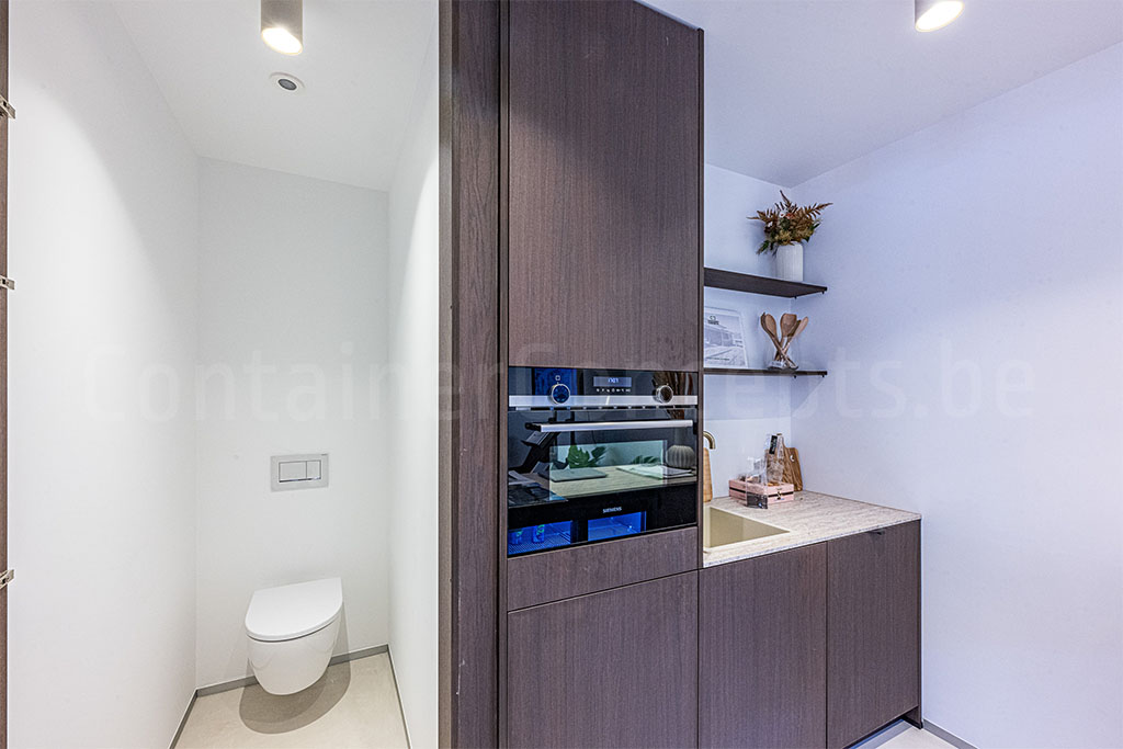 Waarin deze loungecontainer verschilt van het standaardconcept is dat we een keuken en toilet inbouwden en de binnenkant afwerkten met fermacel wanden in plaats van de standaard KOVR panelen. Dit om aan te tonen dat elk concept kan aangepast worden naar wat u in gedachten heeft.