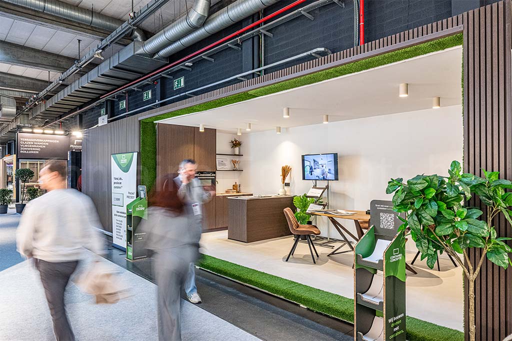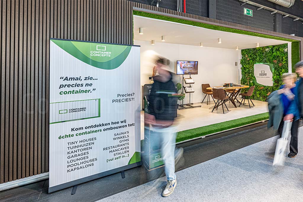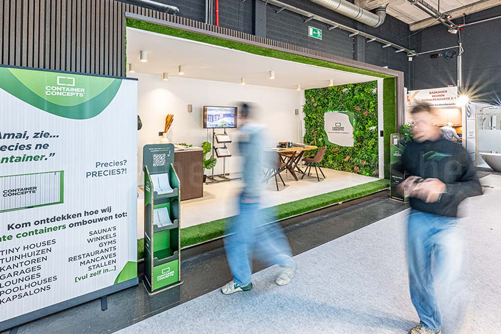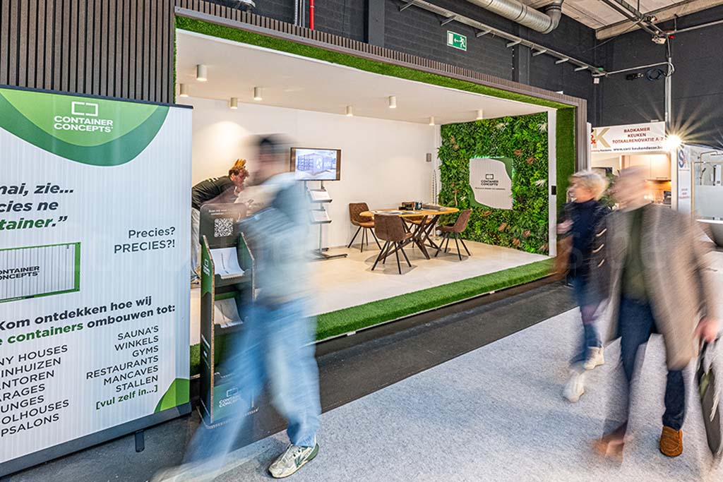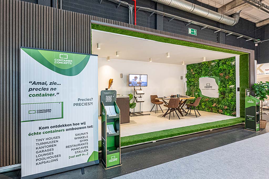 Onze beursstand op de bouw en reno beurs in Antwerp Expo is in essentie de prachtige Santorini loungecontainer. We vertrokken van een nieuwe (one-trip) 40ft container en kortten deze in. Het geheel werd onderverdeeld in een afgescheiden lounge- en berginggedeelte (respectievelijk 6m en 3m).