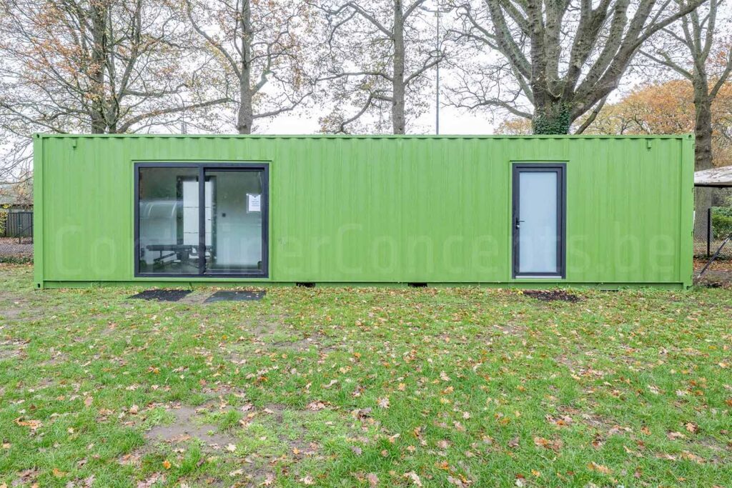Het groen geschilderde exterieur past perfect in de omgeving van de club en geeft de trainingsruimte een frisse, herkenbare uitstraling. Met deze container heeft Hockeyclub Dragons een compacte, maar volledig uitgeruste fitnessruimte voor professionele hockeytrainingen.