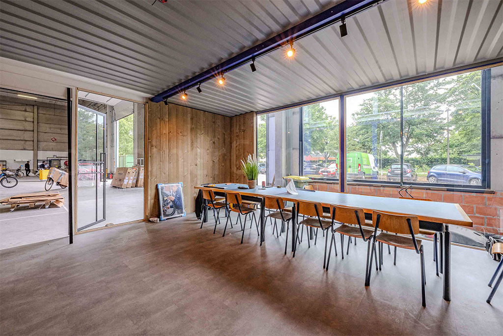 Verschillende containers werden samengevoegd tot handige kantoorruimte. Binnen deze constructie werden ook vergaderzalen, een eetzaal met keuken, sanitaire voorzieningen, omkleedruimte en verhoogd terras voorzien.